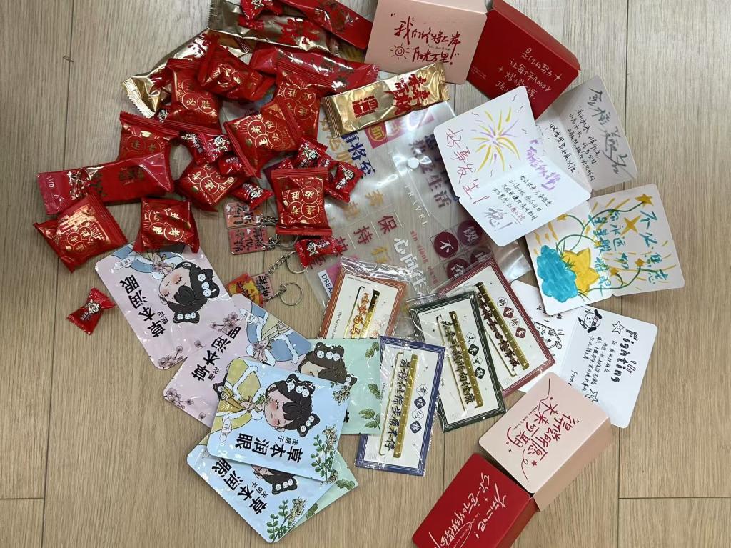 为助力考研学子全力冲刺、圆梦考场,学院精心筹备的"考研加油包"满载温情。礼包中包含学院领导班子、系室主任、教工党支部书记、辅导员及学弟学妹们亲手书写的祝福贺卡;“天道酬勤”励志书签,以隽永文字时刻勉励追梦人;甜蜜糖果,将“金榜题名”的美好祝福融进舌尖;舒缓眼贴,为疲惫的眼眸送上片刻放松;还有刻着“前程似锦”字样的定制钥匙扣,寓意开启通往理想学府的大门。从精神慰藉到实用助力,这份礼包全方位为考研学子保驾护航。