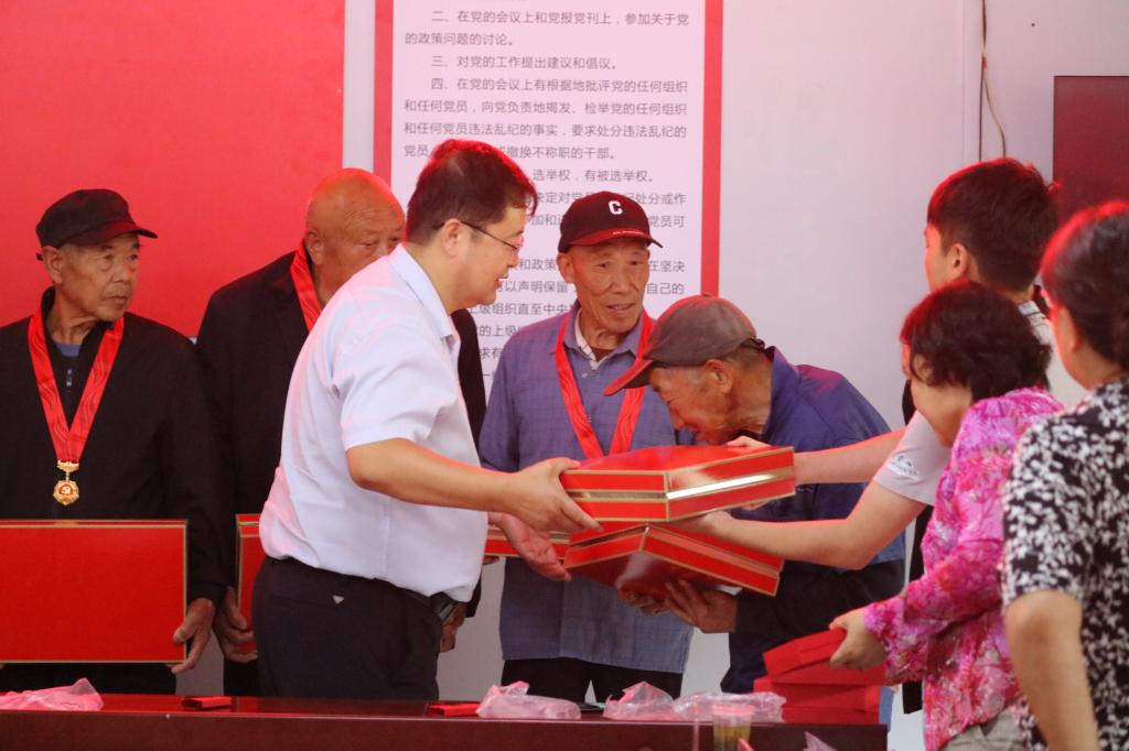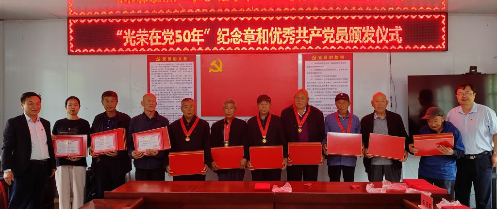 活动第一环节,举行“光荣在党50纪念章颁发仪式。张骞文和张瑞分别为村里10名荣获奖章的老党员逐一佩戴纪念章、发放纪念品,并向荣获奖章的老党员表示热烈的祝贺和崇高的敬意。之后,在张骞文的带领下,全体参会党员面对鲜红党旗,庄严宣誓,重温入党誓词。