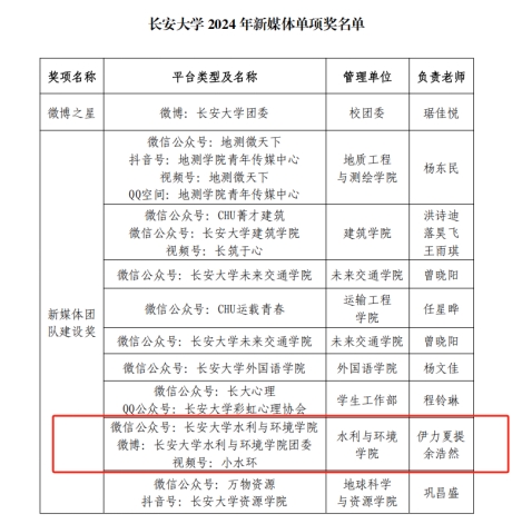 长安大学党委发布了《关于表彰2024年优秀校园新媒体平台的决定》,澳门太阳城集团 微信公众号、视频号、微博平台等荣获“新媒体团队建设奖”。