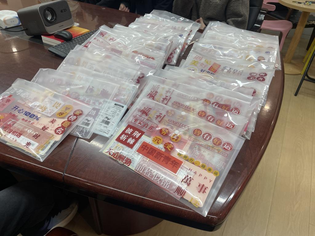 领导班子、系室主任、教工党支部书记、辅导员及学弟学妹们亲手书写的祝福贺卡;“天道酬勤”励志书签,以隽永文字时刻勉励追梦人;甜蜜糖果,将“金榜题名”的美好祝福融进舌尖;舒缓眼贴,为疲惫的眼眸送上片刻放松;还有刻着“前程似锦”字样的定制钥匙扣,寓意开启通往理想学府的大门。从精神慰藉到实用助力,这份礼包全方位为考研学子保驾护航。